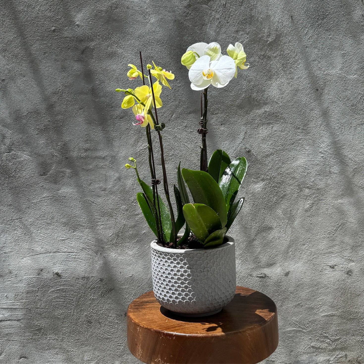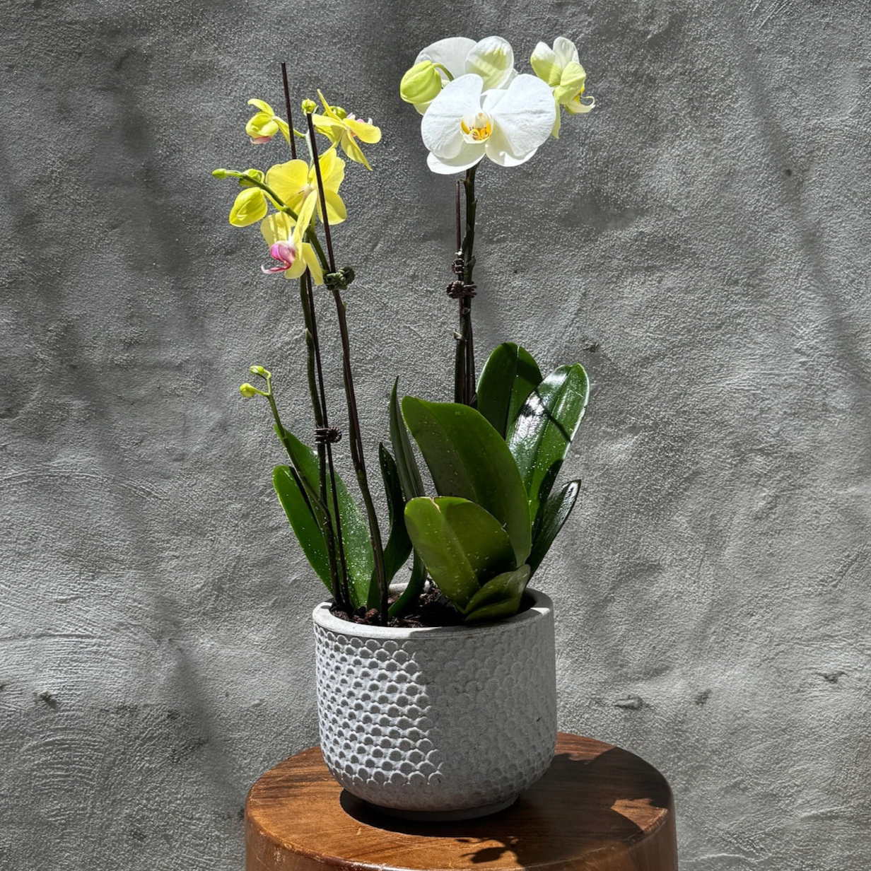 Arreglo de 2 plantas de orquídeas de una vara en matero Beta de la línea brasileña Vouga