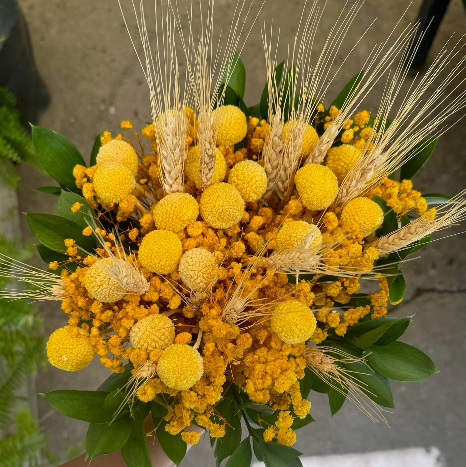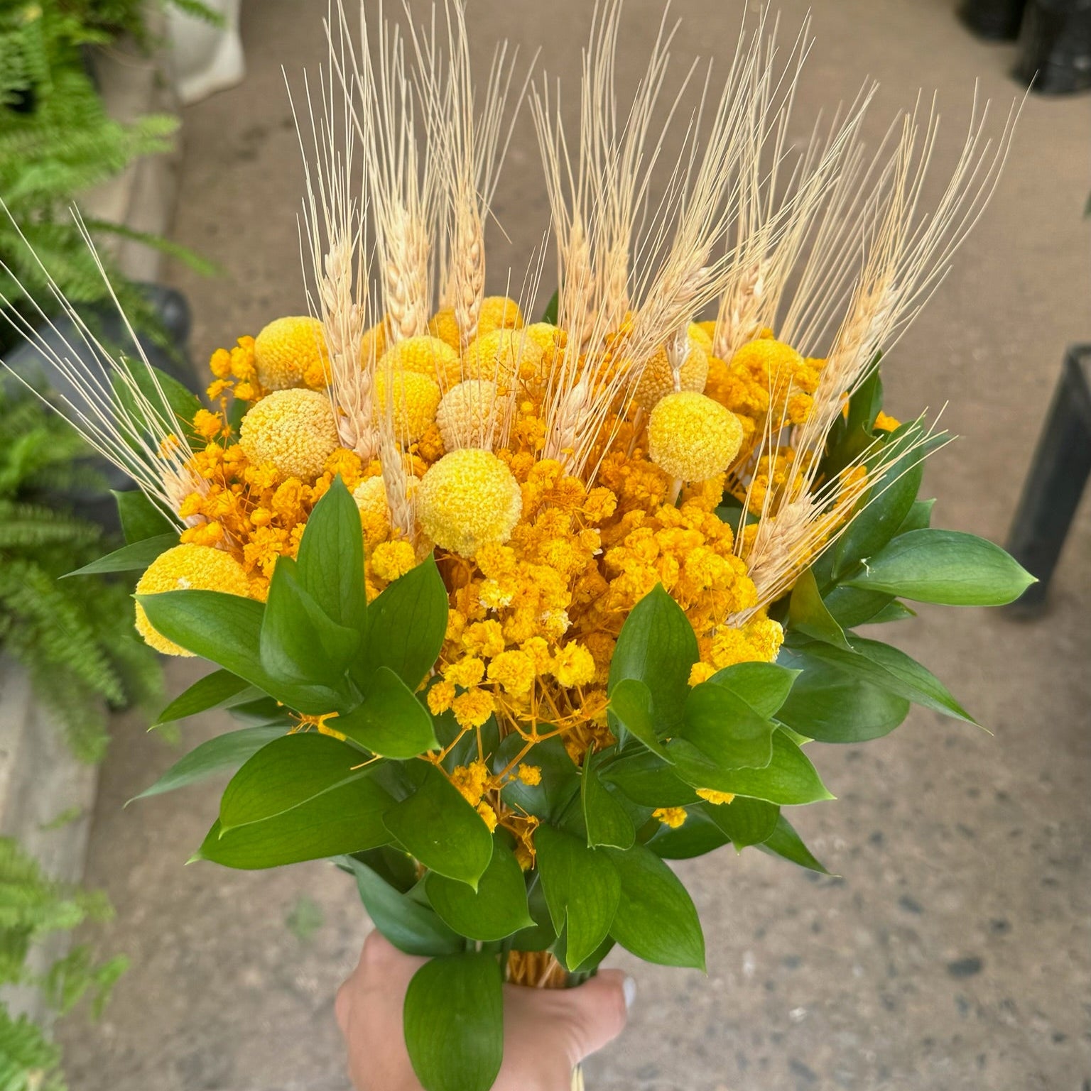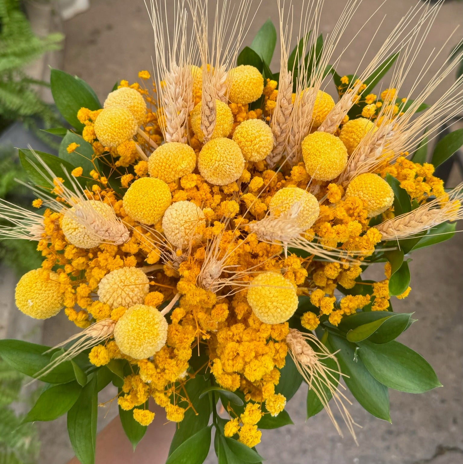1 craspedia + 1 gipsofila preservada + espigas de trigo + rusco