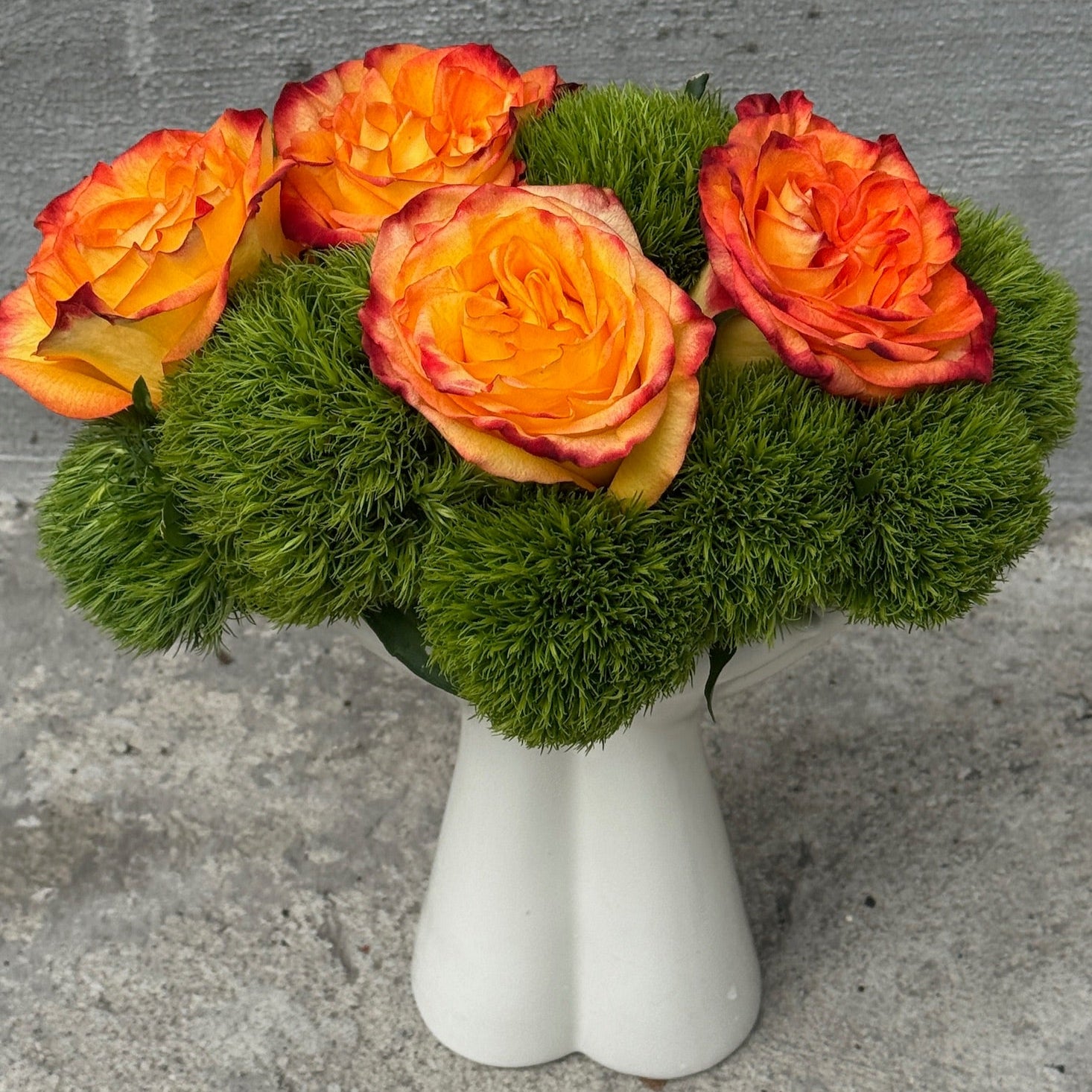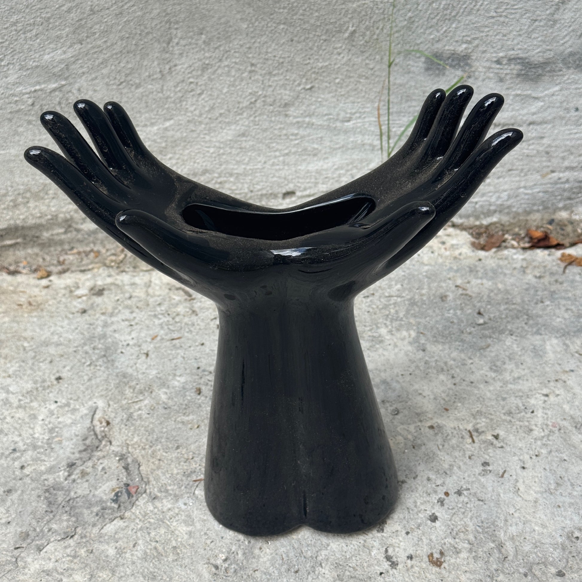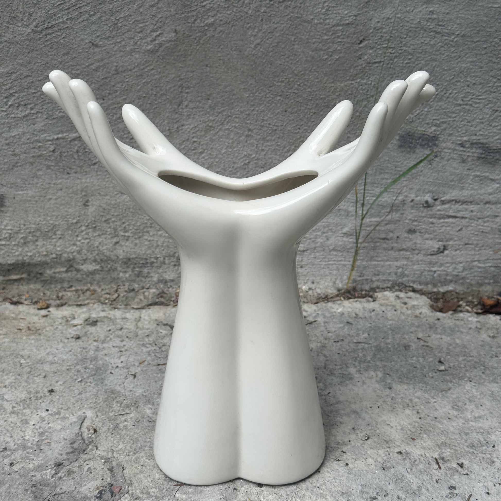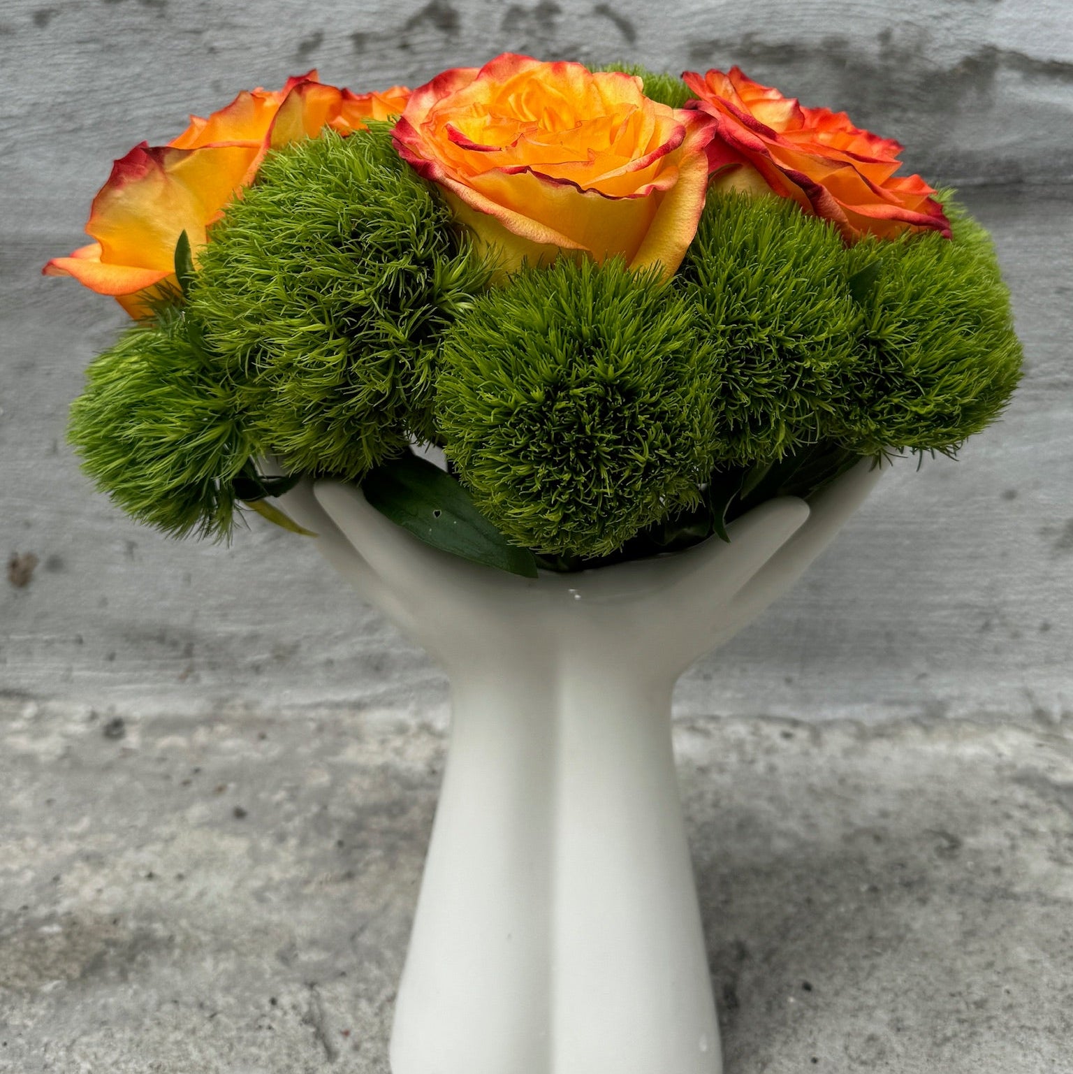 Florero de cerámica en forma de 2 manos + arreglo de rosas