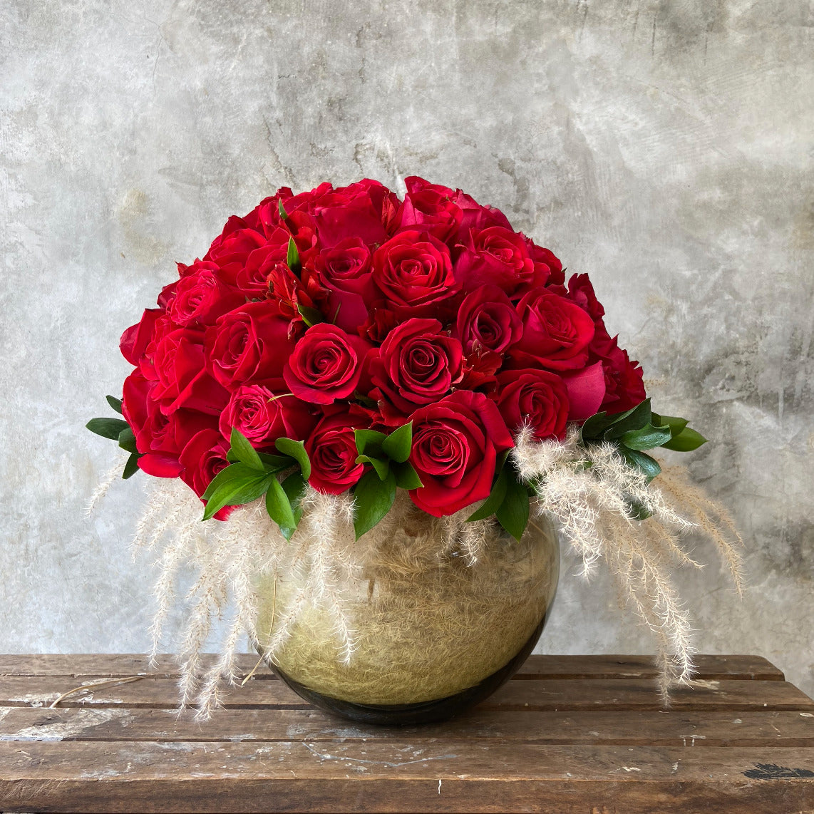 bowl de vidrio + 6 doc de rosas + 2 follajes + 1 pampa