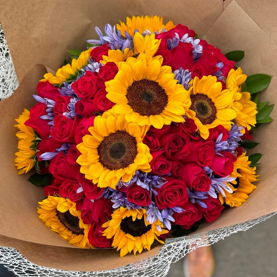 40 rosas + 10 girasoles + agapanto + 2 follajes